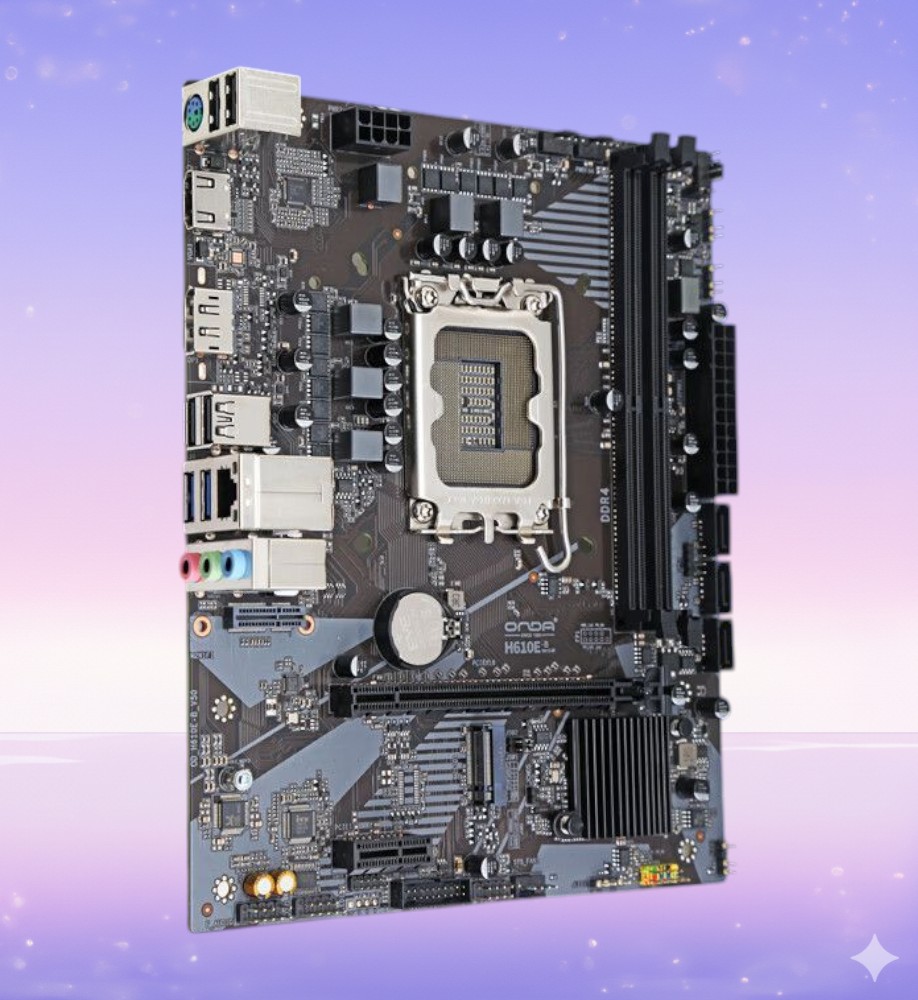 ONDA H610 — компактная материнская плата на чипсете Intel H610 с поддержкой процессоров Intel 12-13 поколения (LGA 1700). Оснащена слотом памяти DDR4, разъёмом M.2 NVMe и PCIe x16 для установки видеокарты, что делает её отличным выбором для игровых и повседневных сборок в формате micro-ATX.